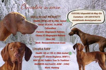Sono attesi per la fine di Marzo ’24 i cuccioli di Papà Locura Fury e mamma Shellycoat Menuett (Tessa), entrambi esenti da displasia anca/gomito e test genetici risultati negativi per le principali malattie congenite indagate. Pedigree di alta genealogia, con genitori e antenati provenienti da rinomati allevamenti europei e internazionali. Papà Fury attualmente in attività venatoria e mamma Tessa in attività di ricerca e soccorso cinofilo di protezione civile. I cuccioli saranno disponibili a partire da Giugno ‘24, in base alle prenotazioni ricevute, vaccinati, sverminati, con microchip e pedigree.