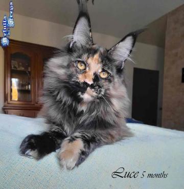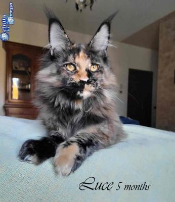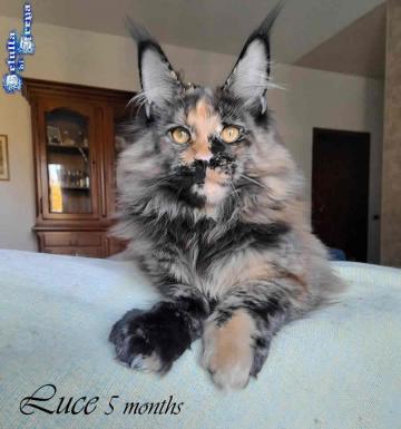 BELLISSIMA E DOLCISSIMA CUCCIOLA RAZZA MAINE COON ALLEVAMENTO BETULLA DI FREYA. Luce ha 5 mesi , bellissima e dolce orsachiotta, ottimo standard e elevata genealogia. Alleviamo da 16 anni e siamo riconosciuti in ANFI-FIFE con affisso Betulla di Freya. Curiamo innanzitutto la salute e il carattere con alimentazione adeguata e di alta qualità. I nostri cuccioli vivono davvero nella nostra casa insieme agli adulti umani e pelosi. Ogni cucciolo ha il pedigree ANFI, viene consegnato con libretto sanitario, vaccinazioni, microchip e regolare contratto di garanzia e kit prime pappe. Restiamo disponibili anche dopo l'adozione per assitere le famiglie nella crescita dei cuccioli.