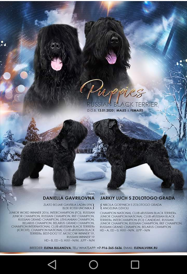Disponibili cuccioli di Terrier Nero Russo. Pedigree di alta genealogia. Genitori plurimi campioni. I piccoli saranno consegnati vaccinati ,con i test genetici e certificato di buona salute. I cuccioli si trovano a Mosca.
