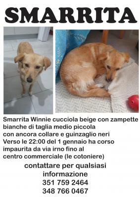 SMARRITA WINNIE cucciola meticcia di 7 mesi beige con il pelo sotto la pancia più bianco e zampette bianche, pelo della coda più folto del resto del corpo, naso e occhi neri, aveva un collarino nero con ancora attaccato il guinzaglio nero intrecciato PROBABILE avvistamento a matierno sta mattina da parte di un signore che però non era sicuro si trattasse della nostra cagnolina Si sarà siciramente allontanata e puó essere ovunque, completamente disorientata , non conosce per niente la zona, deve essere molto spaventata è anche diffidente con gli estranei