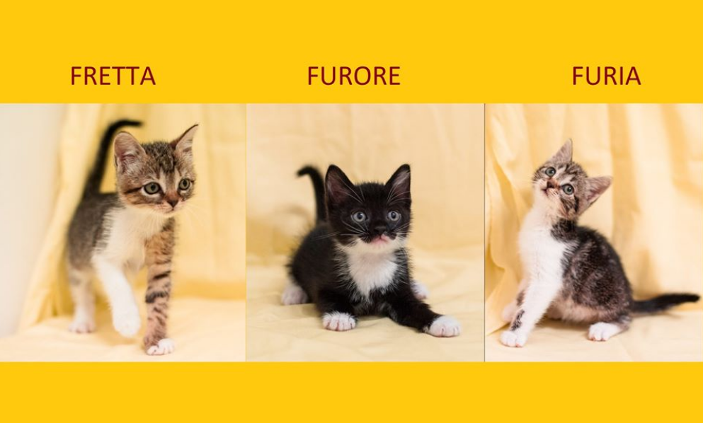 Fretta Furia e Furore hanno 50gg. si affidano, spulciati, sverminati, microchippati, vaccinati e testati fiv/felv. Preferite adozioni di coppia o con almeno un altro gatto in casa. Per ottime adozioni li portiamo personalmente, in auto, a nostre spese, in tutto il centro nord (no staffette!). Solo adozioni in appartamento con finestre e balconi in sicurezza (zanzariere e reti).