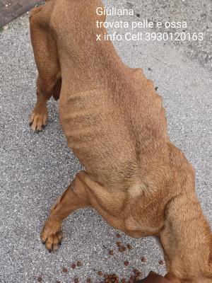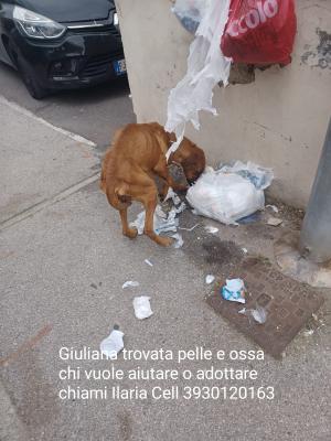 Giuliana 3 anni circa, chiamata così perchè trovata il giorno di Santa Giuliana mentre rovistava nella spazzatura alla disperata ricerca di cibo,una creatura ridotta ad uno scheletro nella più totale indifferenza costretta ad ingoiare carta,plastica e pezzi di carta stagnola!! Giuliana adesso è stata recuperata ed è in sicurezza ma abbiamo bisogno di aiuto,in primis uno stallo e poi si pensarà ad una adozione.La piccola si trova a Napoli,chi può aiutarci ci contatti al numero 3930120163,grazie