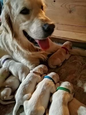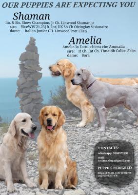 Papà Shaman, Campione Italiano e Sloveno di Esposizione, già Campione Junior, vanta numerosi ulteriori titoli (CQ '22-'23 Qualified, 1st Yearling Championship Show Manchester '23, BOB, BOS, CAC, CACIB, WDS Puppy Winner 2021 - Vice Junior European Winner 2021 - 1st Yearling Class @ Manchester Championship (UK) - Crufts Qualify '22 - '23) ed onorificenze (World Promise 2021, BEST PUPPY, BIS PUPPY, BIS JUNIOR ALL RETRIEVERS) ed ha un carattere dolcissimo ed equilibrato.