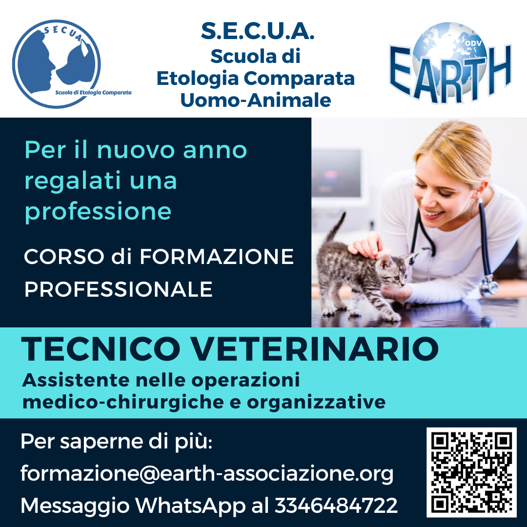 Ami gli animali? Vorresti lavorare al loro fianco e per il loro benessere? SECUA, la scuola di etologia comparata uomo - animale powered by EARTH, organizza il corso per diventare TECNICO VETERINARIO. La durata è triennale con frequenza due week-end al mese, in presenza o anche a distanza: 600 ore di teoria (300 il primo anno e 300 il secondo) e 400 ore di pratica il terzo anno, in cliniche veterinarie convenzionate. Il Tecnico Veterinario è una figura professionale innovativa che assiste il Medico Veterinario coadiuvandolo nella sua attività. VUOI SAPERNE DI PIÙ? Scrivi alla mail formazione@earth-associazione.org » Oppure invia un WhatsApp e sarai richiamato in 72 h