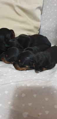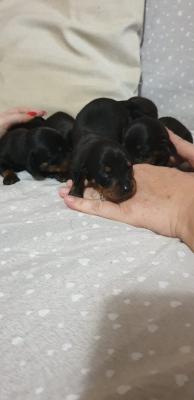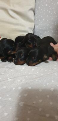 Cuccioli di Bassotto Tedesco a pelo raso, neri focati misura standard. Genitori visibili.