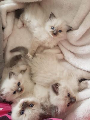 Stupenda cucciolata di ragdoll nata a metà aprile 2019. I cuccioli saranno ceduti a metà luglio circa, completi di libretto sanitario, vaccinazione trivalente e test Fiv e Felv negativi. Disponibili 2 maschi e 2 femmine, tutti in colorazione blue mitted. Contattateci per maggiori informazioni o prenotazioni.