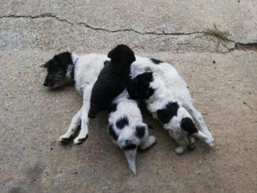 Tre dolcissimi cuccioli razza mista, 2 maschi e 1 femmina, taglia media, eta' 1 mese e 15 gg, svezzati, teneri e intelligenti regaliamo !! una femmina e un maschio colore a macchie bianchi e neri pelo lungo, un maschio nero pelo raso possibilta' di vedere i genitori, Vi aspettiamo!!!