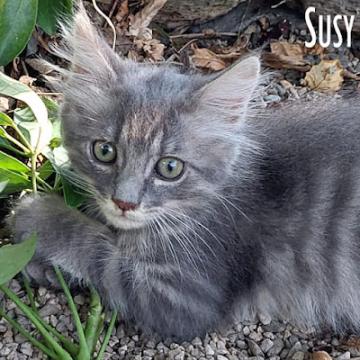 Ciao, sono Susy, una bellissima grigina a pelo lungo. La mia mamma è stata trovata e salvata quando eravamo ancora solo dei batuffoli di pelo, siamo stati davvero fortunati! Io, la mia sorellina Lilly e i miei fratellini Elliot e Leo adesso siamo grandi abbastanza per cercare finalmente la nostra famiglia umana! Non vedo l'ora di conoscere chi mi amerà per tutta la vita e sono pronta a riempire la sua esistenza di amore, gioia e felicità per tanti e tanti anni.