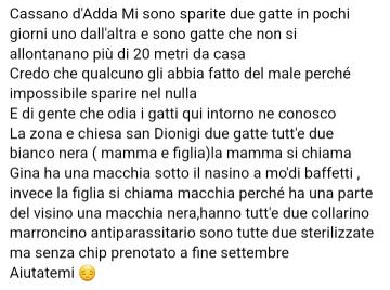 Smarrite due gatte mamma e figlia la mamma e sparita circa un mesetto fa invece macchia la figlia oggi sono 3 giorni,macchia e una gatta molto paurosa e se esce in giardino non si allontana mai entra ed esce di casa ma sia per bere mangiare e fare i suoi bisogni torna a casa Il mio nome è Leo 3285605737