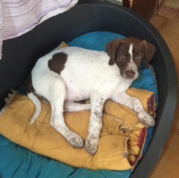 Incrocio Bracco Tedesco, dal manto segoso bianco e marrone, occhi verdi, meraviglioso, vivace, dispettoso e adorabile. Adora rubare le ciabatte e mordicchiarle…