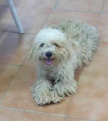 Questa dolcezza si chiama COTTONFIOC una nuvola di pelo, mix Barboncino di taglia piccola, trovato abbandonato in strada con un amico a 4zampe.