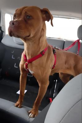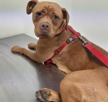 Camilla è una mix Amstaff/ dogue de bordeaux di circa un anno e mezzo che pesa 17 kg e chiede solo di essere amata.