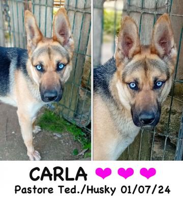 Carla, incrocio Pastore Tedesco/Husky, abbandonata con pettorina e guinzaglio, in una strada molto trafficata, disorientata, i primi giorni non ha toccato cibo, si rifiutava di mangiare, si sentiva tradita, grazie all'amore delle volontarie ha capito che non valeva la pena lasciarsi morire per la m….@ che l’ha abbandonata vigliaccamente,