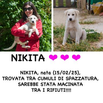 Siamo allo schifo e all’ignoranza TOTALE, Nikita, questa splendida cucciola è stata trovata dagli operatori ecologici tra i rifiuti, I SUOI LAMENTI/URLA hanno attirato l’attenzione, era talmente piccola che non la si trovata, con tutta la disperazione e la paura che aveva in corpo ha continuato a ringhiare pietrificata dalla paura. Portata subito dalle volontarie, Nika cercava di difendersi ringhiando, era l'unica cosa che poteva fare. Ben presto però ha capito che la sua vita stava cambiando, ed ora è una cucciola sicura, dolcissima e bellissima, che adora essere coccolata e presa in braccio, ben socializzata con tutti, quadrupedi e bipedi.