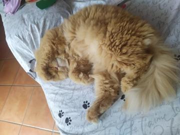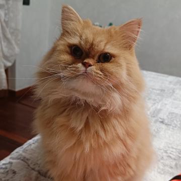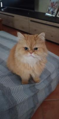 Smarrito gatto persiano arancione, grande, con collare in tessuto mordibo.
