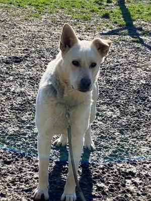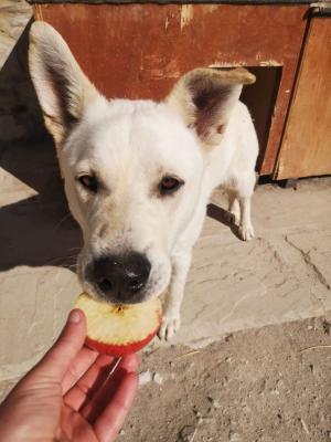 E' di taglia grande, per 40 kg di peso, e ora ha poco più di 3 anni. Ha un carattere buonissimo, non dominante, è ancora molto giovane ma resterà molto buono, purtroppo è però rimasto un poco timido con le persone e un poco distaccato nei confronti dell uomo. Necessita di percorso con un educatore ma è curioso e ben disposto a mettersi in gioco.. Ama fare merenda con la mela! Sta facendo della fisioterapia in acqua consigliata dall'ortopedico. Assume degli integratori per le articolazioni. Compatibile con tutti i suoi simili, con loro è rispettoso e mai invadente, invece non compatibile con bambini.