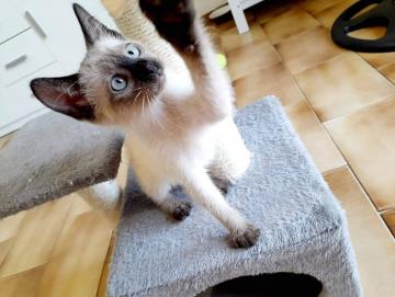 Dolcissima gattina siamese di due mesi e mezzo, sverminata, spulciata e vaccinata, con libretto sanitario, molto affettuosa e coccolona, di colore bianco-noce, cerca nuova famiglia amante della razza. Regaliamo anche un bellissimo tiragraffi nuovo a piu piani. Contatto telefonico o whatsapp al numero 3714282110, Luigi.