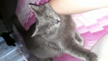 Scorparsa gatta a pelo lungo grigia occhi gialli con piccole sfumature bianche