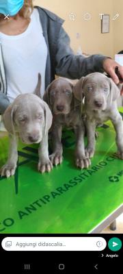 Disponibili 3 splendidi cuccioli weimaraner nati il 20/02/2022 . Sono 3 maschietti e verranno ceduti sverminati, microchippati e con pedigree. Genitori visibili. Per qualsiasi info contattare Angelo al.