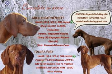 Nati il 30 Aprile i cuccioli di papà Locura Fury e mamma Shellycoat Menuett (Tessa), entrambi esenti da displasia anca/gomito e test genetici risultati negativi per le principali malattie congenite indagate. Pedigree di alta genealogia, con genitori e antenati provenienti da rinomati allevamenti europei e internazionali. Papà Fury impegnato in attività venatoria e mamma Tessa in attività di ricerca e soccorso cinofila di protezione civile. I cuccioli saranno disponibili a partire da Giugno '24 in base alle prenotazioni ricevute, vaccinati, sverminati, con microchip, pedigree ENCI e iscrizione ad anagrafe canina.