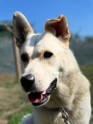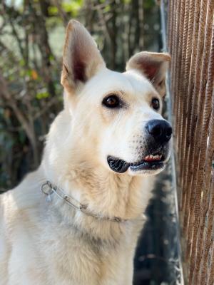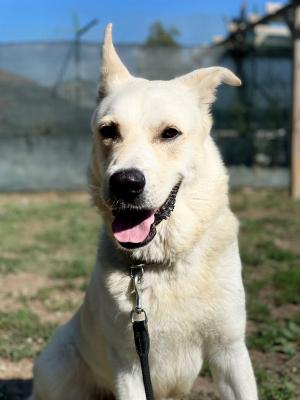 E' di taglia grande, per 40 kg di peso, nato nel 2019. Ha un carattere buonissimo, non dominante, è ancora molto giovane ma resterà molto buono, purtroppo è però rimasto un poco timido con le persone e un poco distaccato nei confronti dell’uomo, soprattutto ora che è tornato in canile. Necessita di percorso con un educatore. Ama fare merenda con la mela! Sta facendo della fisioterapia in acqua consigliata dall'ortopedico. Assume degli integratori per le articolazioni. Ha fatto un check completo da qualche giorno: sta abbastanza bene. Semplicemente è necessario al momento fargli seguire una dieta a base di mangime Urinary (ma nulla di preoccupante).
