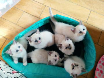 Disponibili 6 splendidi cuccioli Ragdoll: 3 Maschi Liliac bicolor 1 Maschio Liliac 1 Femmina Blue 1 Femmina Blue Bicolor Nati il 17 settembre 2022 verranno ceduti per metà dicembre. Verranno ceduti con Pedigree AFEF, due vaccinazioni, libretto sanitario, microchip.