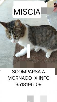 Ciao la gattina Miscia è scomparsa dal 3/2/2025 a mornago in via belvedere n.2 un segno particolare per riconoscerla è che i cuscinetti delle zampe posteriori sono rosa e neri, spero che questo mex possa aiutarmi a ritrovarla