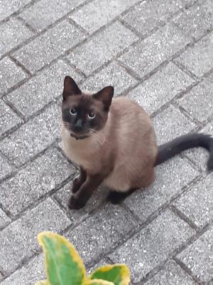 Trovato un gatto siamese. Giovane, 6-7 mesi di vita. Porta collare antipulci. Montefano.