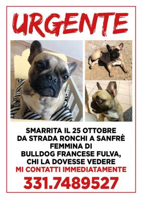 Smarrita il 25 ottobre da strada ronchi a Sanfrè femmina di bulldog francese fulva Chi la dovesse vedere mi contatti immediatamente al 3317489527