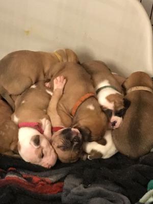 Ciao a tutti! Vendo bellissimi cuccioli di amstaff nati la notte tra il 14 e 15 gennaio..sono ancora disponibili 4 femmine e 5 maschi..verrano consegnato con pedigree ,microchip, primo vaccino,sverminati I genitori sono entrambi con il pedigree e soprattutto esenti da malattie genetiche e senza displasia, sono entrambi visibili (la mamma e di mia proprietà mentre il padre di una mia amica quindi per vederlo dovrei saperlo prima e organizzare) I cuccioli non verranno affidati a tutti ma mi permetto di fare una rigorosa selezione perché esigo che vengano trattati con tutto l'affetto che vorrei dargli io! Per informazioni e altre foto chiamate o mandate un messaggio al 3477387328. Grazie!