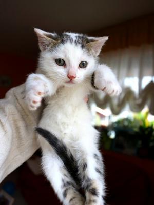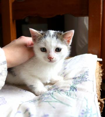 Questa micetta cerca casa! E' rimasta sola perché i fratellini sono gia stati adottati! Ha due mesi, bianca con macchie marroni!