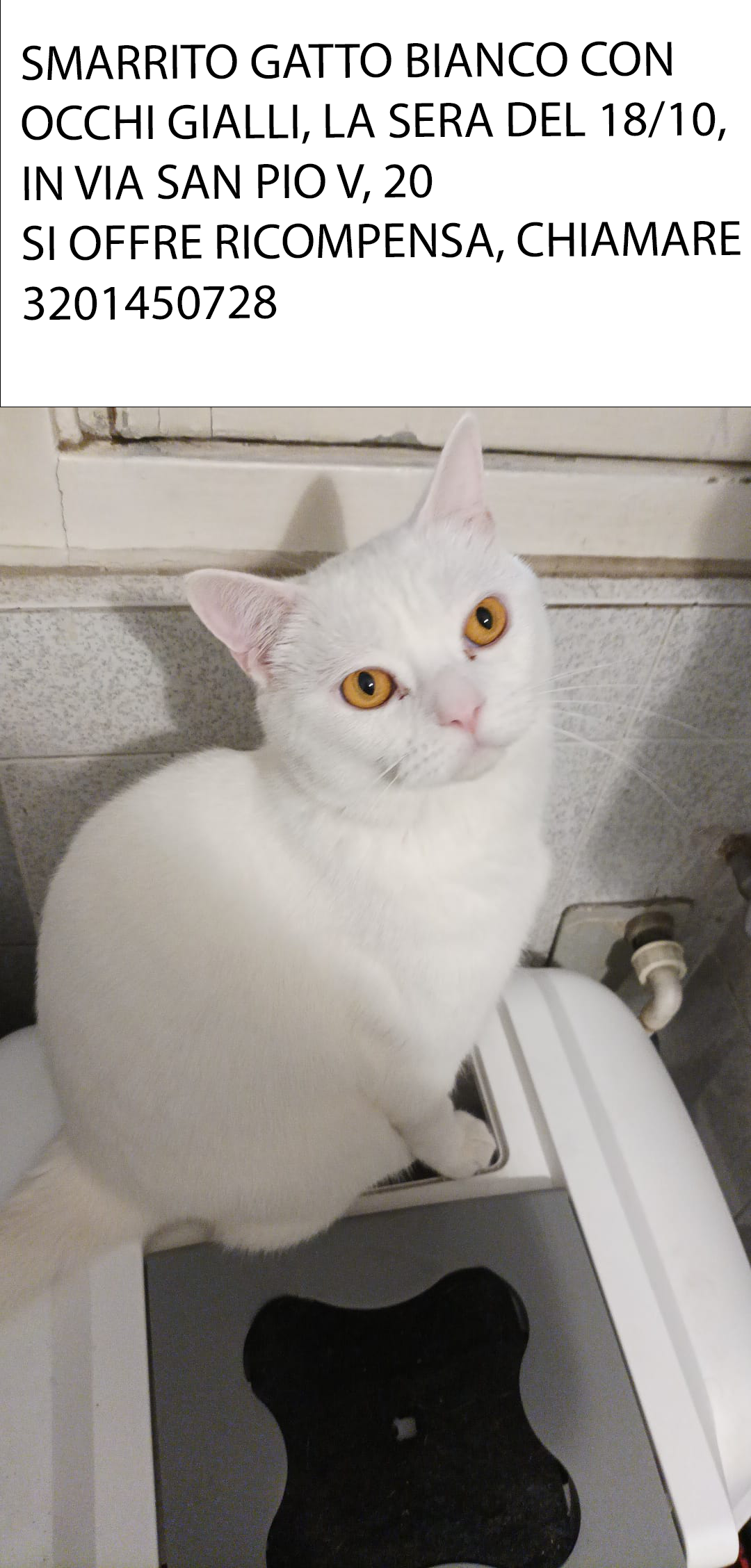 Smarrito in Via san pio V, 20 un gatto bianco di circa 4 anni microchippato, qualsiasi informazione o avvistamento contattare 3201450728, si offre ricompensa, grazie