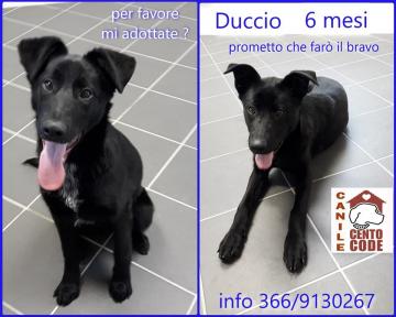 DUCCIO : UN DOLCISSIMO RUBA CUORI ..! .. Duccio è un cucciolo di circa 6 mesi , bellissimo e di una simpatia a cui è impossibile resistere .. con il suo musetto delizioso , assume delle espressioni così tenere, che non si può non riempirlo di coccole e baci .. un pò pastore belga , un pò labrador, è tutto nero carbone, e sul petto una macchia bianca .. ha grandi orecchie con la punta ripiegata e ogni tanto riesce a drizzarne una , e ha un'aria così buffa .. è di carattere socievole , solare e allegro , fa mille feste a tutti e la sua coda non smette mai di scodinzolare .. Duccio non vede l'ora di conoscere la sua famiglia .. ..!.. per informazioni 366/9130267 (orario 9/12 15/18 no festivi ) ..