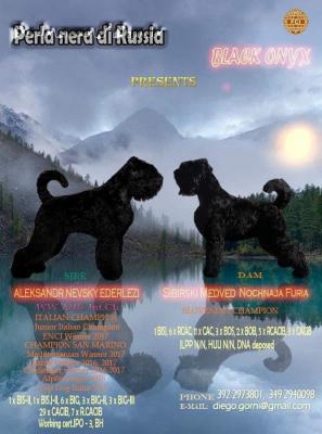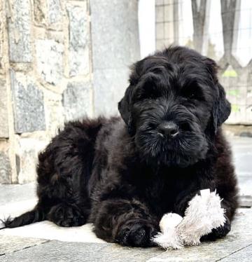 Cuccioli di terrier nero russo (Tchiorny Terrier) con genitori ultracampioni e di altissima genealogia, entrambi visibili. I cuccioli sono nati il 16 settembre e sono disponibili da subito. Verranno consegnati sverminati, vaccinati, con microchip, pedigree e certificato veterinario. Esenti da malattie genetiche, testati.