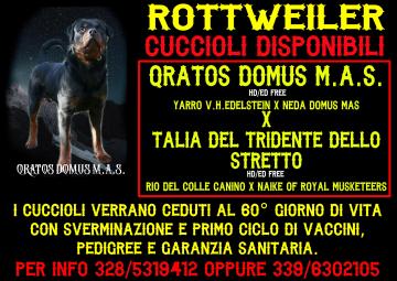 Disponibili Cuccioli figli di QRATOS DOMUS M. A. S. MULTI V1 HD/ED FREE (YARRO V. H. EDELSTEIN X NEDA DOMUS M. A. S.) e TALIA DEL TRIDENTE DELLO STRETTO HD/ED FREE(RIO DEL COLLE CANINO X NAIKE OF ROYAL MUSKETEERS) . I cuccioli verranno ceduti al 60° giorno con 2 sverminazione, primo ciclo vaccinale, pedigree e garanzia sanitaria.