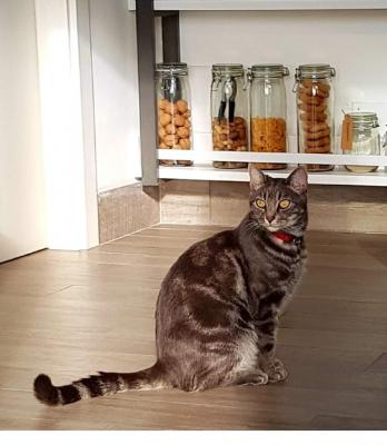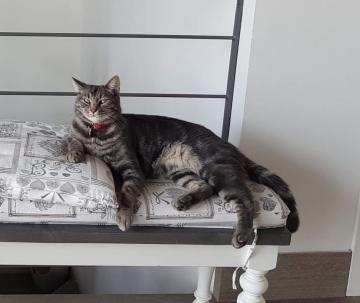 Caleb, gatto maschio castrato di 5 anni. Mantello tigrato con due cerchi chiari sui fianchi. Collarino rosso con numero di telefono e microchip.