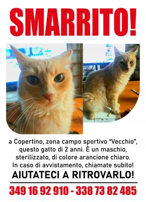 Smarrito da quattro giorni Nino, gatto maschio di 2 anni sterilizzato . Abitiamo alle spalle del vecchio campo sportivo di Copertino , vicino ex INAM, è uscito di casa a mezzanotte e mezza e da lì sparito nel nulla. È un gatto di casa, esce poco e non si allontana mai dal perimetro della nostra abitazione . È docile, ma può essere spaventato. Siamo distrutti e desideriamo che torni a casa sua. Perfavore aiutateci a ritrovarlo.