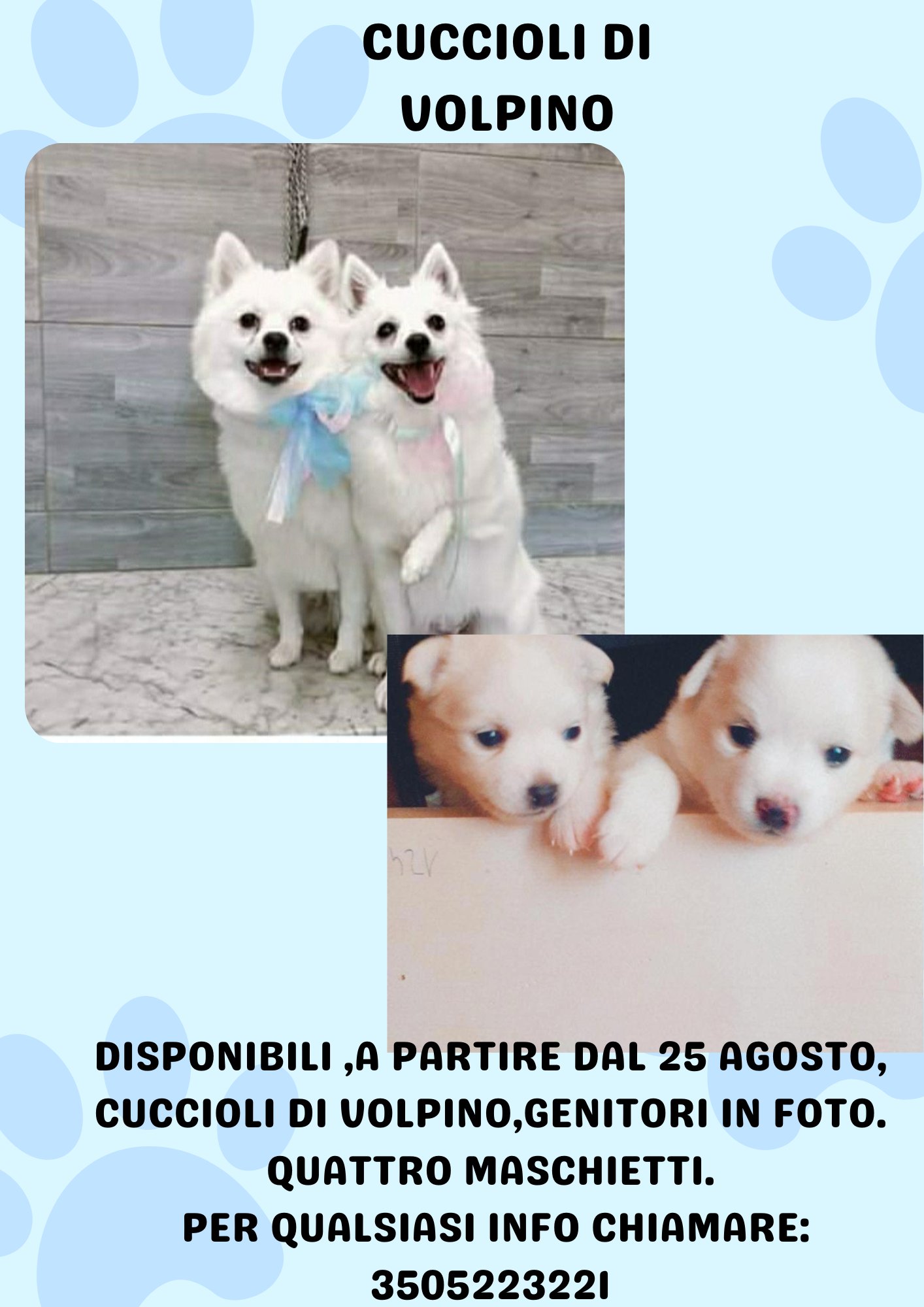 Come da titolo, sono disponibili cuccioli di volpino italiano, madre e padre in mio possesso, per qualsiasi informazione non esitate a contattare. I cuccioli verranno consegnati al termine dei 60 gg, con primo ciclo di vermigugo. Per info chiamare: 379 116 2786 Maria