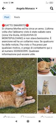 GATTO SMARRITO Si chiama Morfeo ed ha circa un anno. L'ultima volta che l'abbiamo visto è stato sabato sera (zona Via Giulia, ACQUAVIVA DI MONTEPULCIANO) e non stava benissimo. È arancione ed ha un collarino rosa.Se qualcuno na delle notizie, l'ha visto o l'ha preso per qualsiasi motivo, vi prego di contattarmi qui o al numero 3335033399. Qualsiasi informazione può essere utile