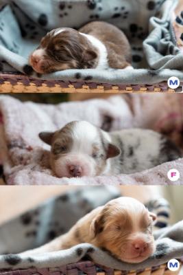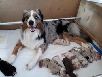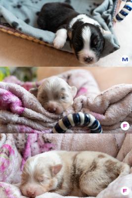 A breve disponibili per la prenotazione splendidi cuccioli di Pastore Australiano: in foto la mamma Jolie (blue merle) e il papà Ares (red tricolor), vantano un brillante pedigree e godono di ottima salute. I cuccioli sono nati il 13.03.23 in ambiente domestico e crescono in casa, quindi con un'ottima socializzazione con animali e adulti. Saranno ceduti a partire dalla metà di maggio, sverminati, vaccinati e completi di libretto sanitario, microchip e pedigree ENCI.