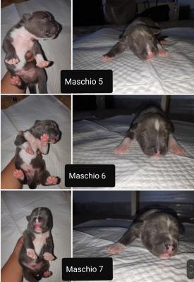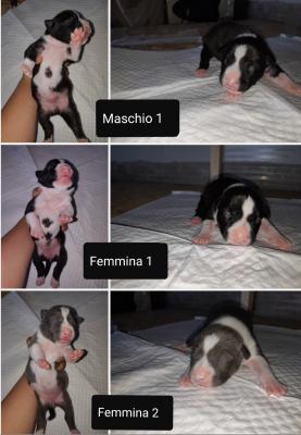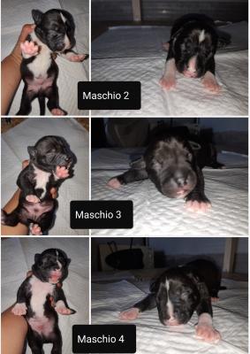 Cuccioli di American Staffordshire Terrier, 4 maschi e 1 femmina nero con bianco, 3 maschi e 1 femmina blue con bianco. Selezionati per carattere e morfologia - White Rock Bloodlines.