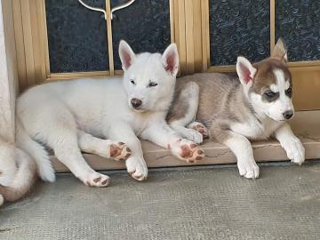Cuccioli di siberian husky nati il primo maggio, 2 maschi bianchi( total white) occhi uno celeste e uno marrone, 1 maschio bianco/beige occhi.celeste/verde e 1 femmina bianco/nero occhi blu. Genitori visibili. Vaccinati e sverminati. Disponibili da subito.
