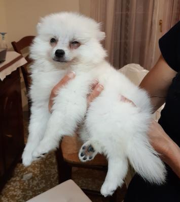 Vendo spitz pomeriana tutto bianco, taglia molto piccola, maschietto di due mesi, con microchip e vaccini, no pedigree.