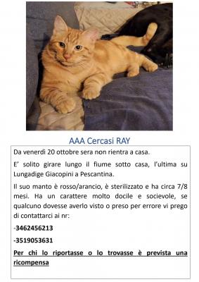 Da venerdì 20 ottobre Ray non torna a casa. È un maschio sterilizzato, dal manto rosso. È molto socievole e buono. Ha circa 7/8 mesi.