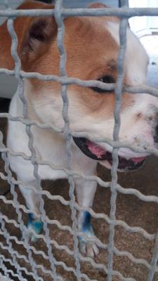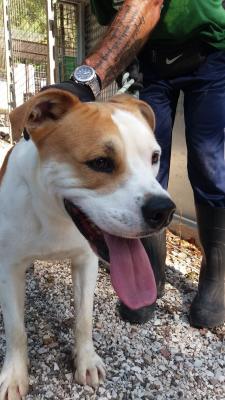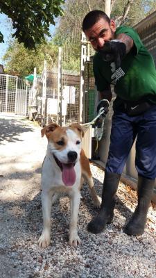 E' ancora bellissimo, ha solo 11 mesi, tutto bianco con macchie arancio, un american pitt terrier di circa 30 kg, forse meno perché qui in canile il cibo per i cani non è molto e possono mangiare solo 1 volta al giorno.