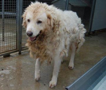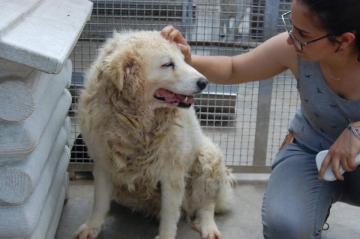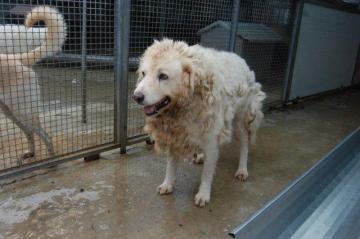 Ha il pelo sporco e aggrovigliato perché per 14 anni nessuno l'ha lavata, né spazzolata, e soprattutto perché lei, una maremmana bianca, pulitissima come tutti i cani che sporcano sempre lontano da dove vivono, è stata costretta per 10 anni a vivere sdraiata sui suoi escrementi.