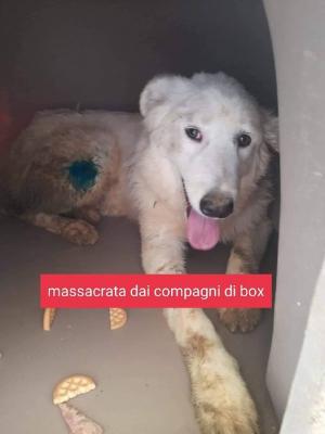 NEVE CUCCIOLA 8 MESI SIMIL MAREMMANA Neve è in canile da quando aveva 2 mesi. Stamattina la volontaria ha assistito a una scena a dir poco agghiacciante. Ha notato un gran nuvolone di polvere, gli altri cuccioli nel suo box l’avevano presa di punta, tutti gli altri cani che abbaiavano, se non c’era la volontaria l’avrebbero uccisa, hanno fatto branco contro di lei e la stavano massacrando, era già la seconda volta che la picchiavano. E’ stata spostata in un altro box, ma è terrorizzata, piena di buchi su tutte le cosce, ha una brutta ferita all’orecchio è stata disinfettata ora prenderà antibiotico per qualche giorno e vedremo. Neve ora ha davvero bisogno di essere amata da una famiglia. Buonissima. Adottabile centro nord Italia. Maria 340-5071137