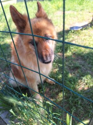 E' affetto da paraplegia agli arti posteriori, causata dalla vecchiaia e sicuramente dall'umidità di tutti questi anni passati dentro un box sempre bagnato e freddo. Il canile adesso lo ha messo in un recinto di terra, per evitare che si piagasse trascinandosi sul cemento, ma anche questo non è un posto adatto a lui, le sue zampe non possono che peggiorare a contatto costante con l'umidità della terra, e peggio ancora sarebbe il cemento bagnato e duro, dove scivolerebbe e trascinandosi si lesionerebbe.