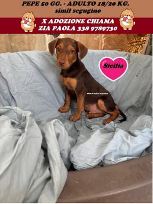 PICCOLO AMORE INNOCENTE E' STATO TROVATO ABBANDONATO IN APERTA CAMPAGNA PEPE 50 gg. DA ADULTO 18/20 KG. (simil segugino) CERCA URGENTEMENTE UNA FAMIGLIA