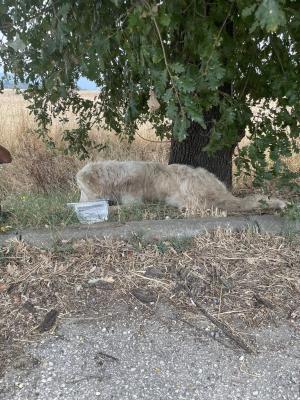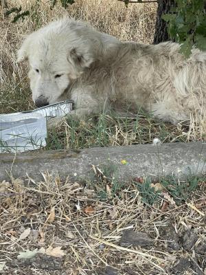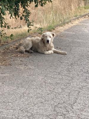 Trovato un pastore maremmano, magrissimo,mal messo, con zecche e pulci, con ferite, che cammina a stento